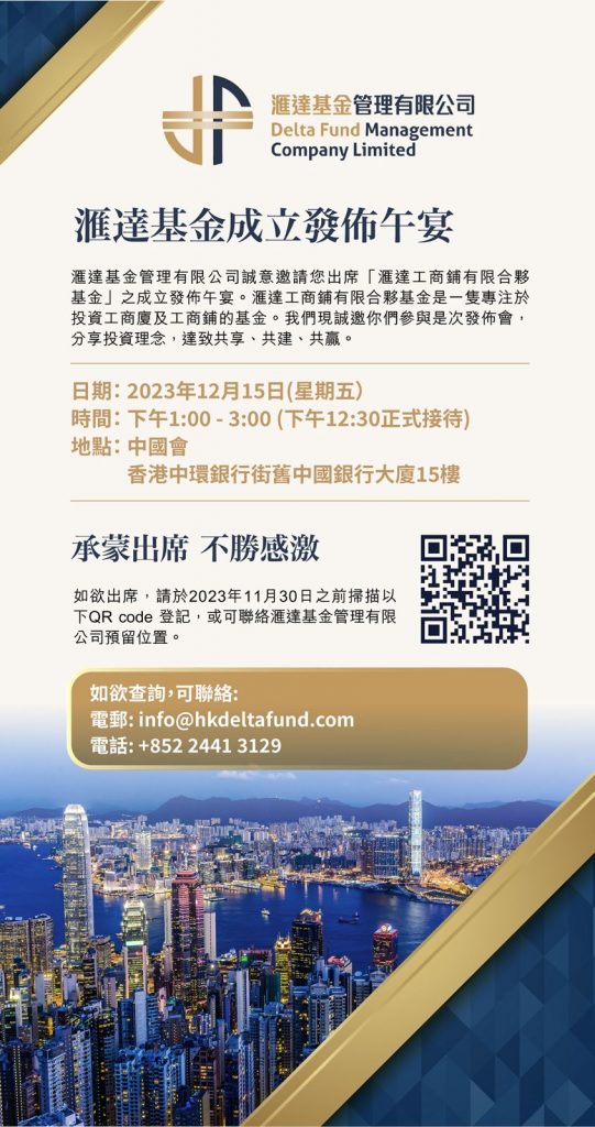 滙達資產管理有限公司(Delta Fund Management Company Limited)成立於2023,是香港首間專注工業大廈、商鋪買賣及發展的持牌資產管理公司。憑藉團隊精明獨到的洞察力和豐富的工業大廈、商鋪投資經驗,滙達一直努力不懈,嚴選優質商鋪資產,為客戶提供專業的資產管理和投資方案。公司致力打造優質的投資組合,為客戶創造長期的投資回報。